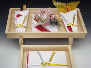 • 結納品セット、広蓋、袱紗、風呂敷、毛氈などを準備する。