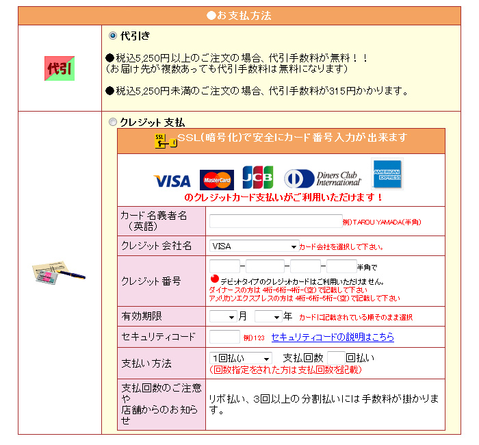 【7】お支払方法をお選びください (代金引換・クレジットカード)