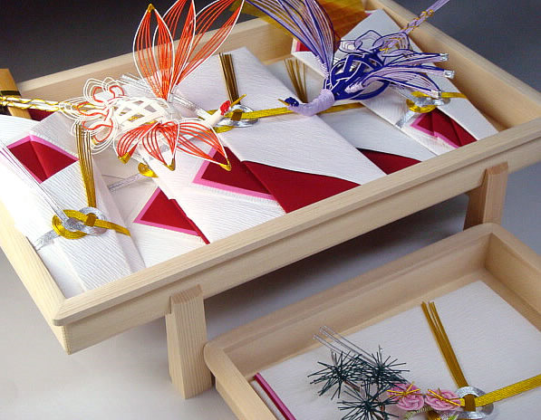 | 内容 | 熨斗、末広(男性用モーニング扇子・女性用黒塗り金銀扇子)、祝儀袋、水引の飾り、玉縁尺四台、目録、玉縁片木 |