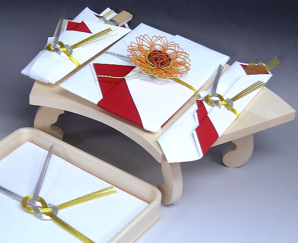 | 内容 | 熨斗、末広(男性用白扇・女性用金銀扇子)、祝儀袋、水引の飾り、扇面台、目録、片木 |