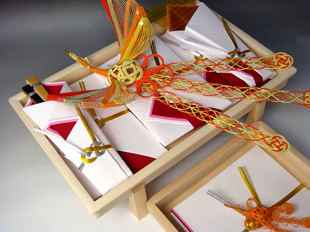 | 内容 | 熨斗、末広(男性用モーニング扇子・女性用黒塗り金銀扇子)、祝儀袋、水引の飾り、玉縁尺四台、目録、玉縁片木 |
