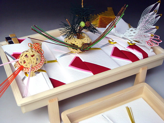 | 内容 | 熨斗、末広(男性用モーニング扇子・女性用黒塗り金銀扇子)、祝儀袋、水引の飾り、玉縁尺四台、目録、玉縁片木 |