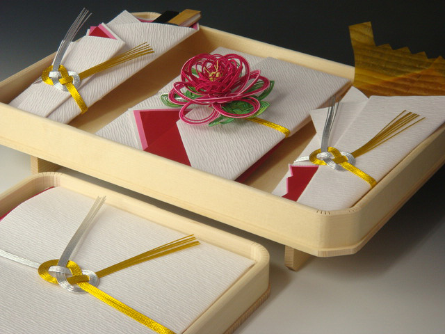 | 内容 | 熨斗、末広(男性用モーニング扇子・女性用黒塗り扇子)、祝儀袋、水引の飾り、祝儀台、目録、片木 |