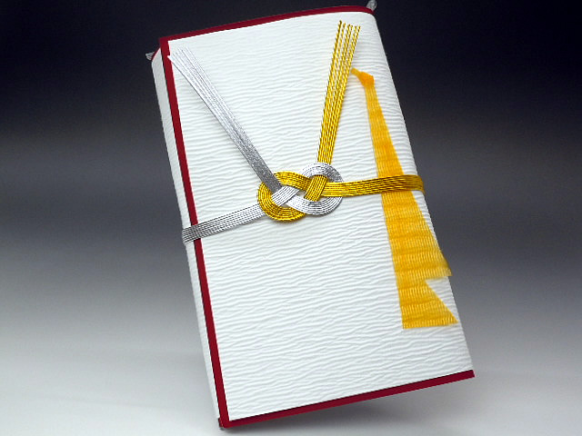 祝儀袋は、機械漉き奉書に7本付けの赤白水引で結んでいます。