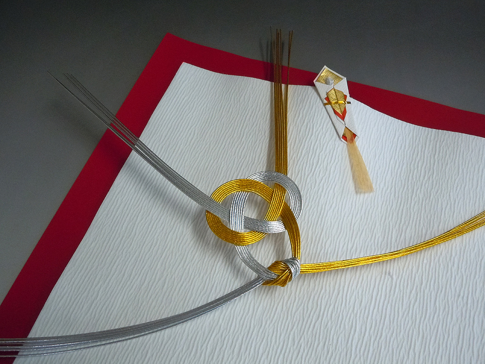 手漉き檀紙(だんし)と顔料染め紙を重ねて、その上から水引を結びます。