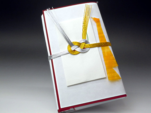 祝儀袋は、機械漉き奉書に7本付けの赤白水引で結んでいます。