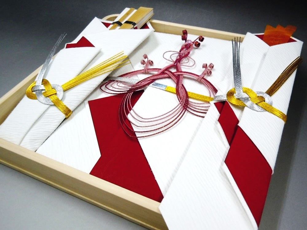 | 内容 | 熨斗、末広(男性用白扇・女性用白扇)、祝儀袋、水引の飾り、片木 |