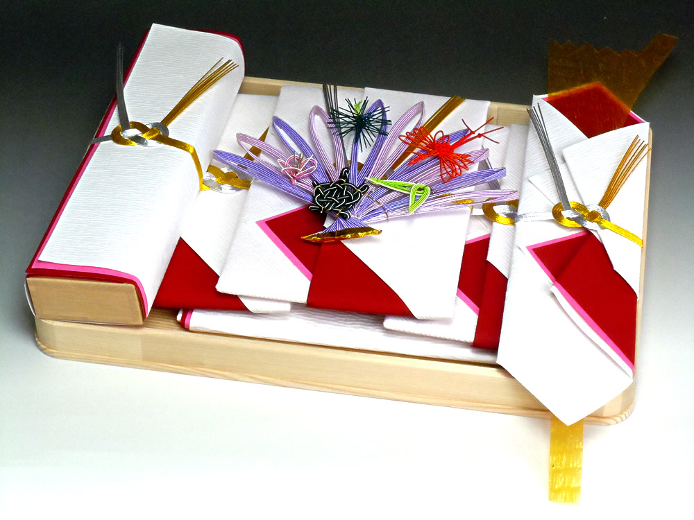 | 内容 | 熨斗、末広(男性用白扇・女性用白扇)、祝儀袋3枚、水引の飾り、目録、片木(尺二) |