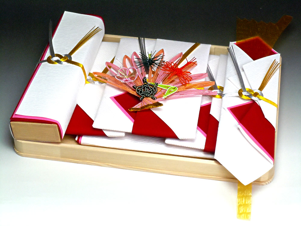 | 内容 | 熨斗、末広(男性用白扇・女性用白扇)、祝儀袋3枚、水引の飾り、目録、片木(尺二) |