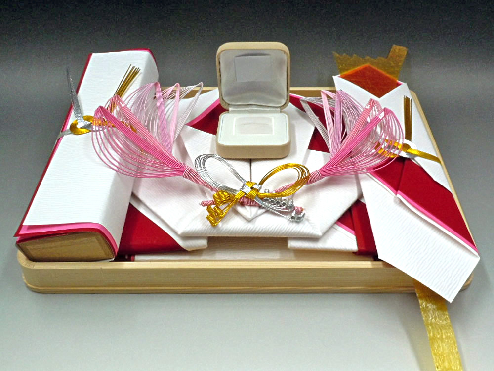 | 内容 | 熨斗、末広(男性用白扇・女性用白扇)、祝儀袋2枚、水引の飾り、目録、片木(尺二)、ふくさ、風呂敷(綿) |