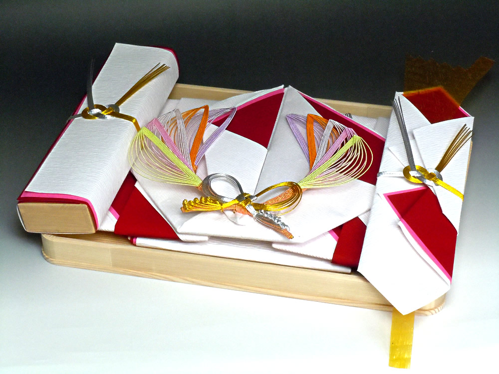 | 内容 | 熨斗、末広(男性用白扇・女性用白扇)、祝儀袋3枚、水引の飾り、目録、片木(尺二) |