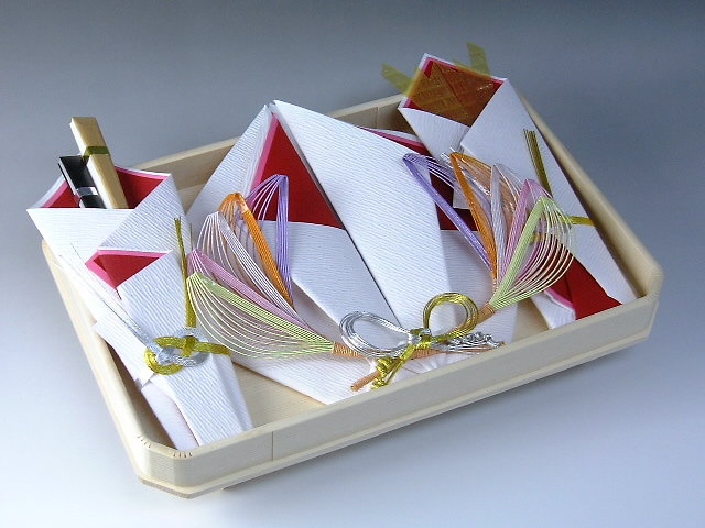 | 材料 | 手漉き檀紙、顔料染め赤紙、水引、本熨斗、手漉き奉書(桃色) |