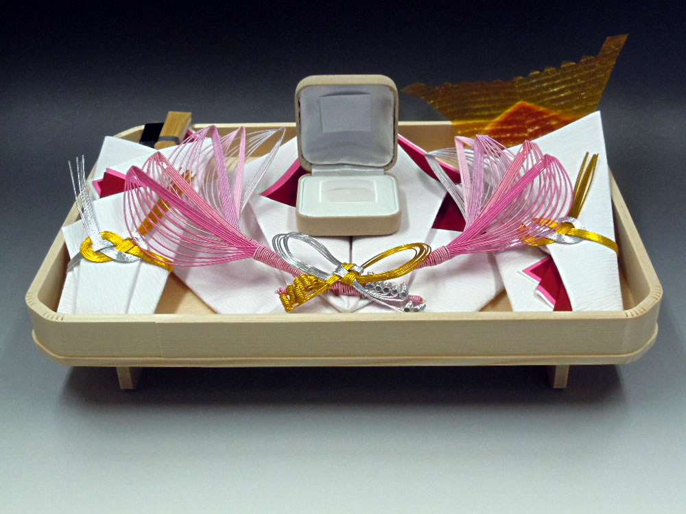 | 内容 | 熨斗、末広(男性用モーニング扇子・女性用金銀扇子)、水引の指輪飾り、祝儀台(長)、目録、片木 ※指輪のケースは付いていません |