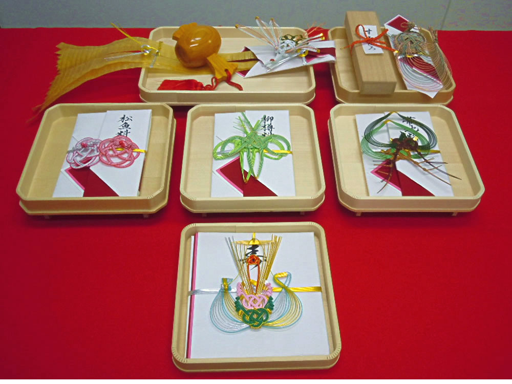| 内容 | ・熨斗 ・末広(モーニング扇子、女性用白扇) ・小槌 ・祝儀袋3枚(結納金・柳樽料・松魚料 各1枚) ・目録 ・水引の飾り ・祝儀台(角)3台 ・祝儀台(長)1台 ・片木 |