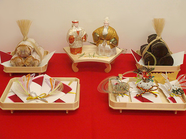 | 内容 | ・熨斗 ・末広(男持ち白扇、女持ち金銀扇子) ・祝儀袋3枚(結納金・柳樽料・松魚料 各1枚) ・目録(写真には写っていません) ・水引の飾り ・祝儀台(長)2台(写真手前の台) ・祝儀台(小)2台(写真奥の左右の台) ・扇面台(写真奥の中央の台) ・片木(写真には写っていません) ・高砂(※変更の可能性あり) ・昆布、スルメ ・敷き紙(指輪用、昆布・スルメ用) |