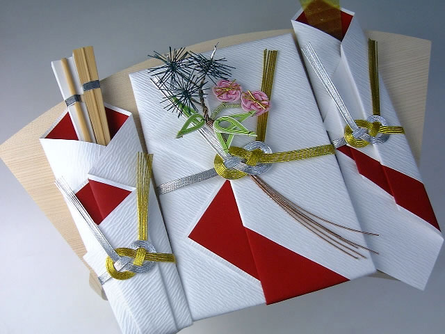 | 内容 | 熨斗、末広(男性用白扇、女性用白扇)、松竹梅の祝儀袋、扇面台、目録、片木 |
