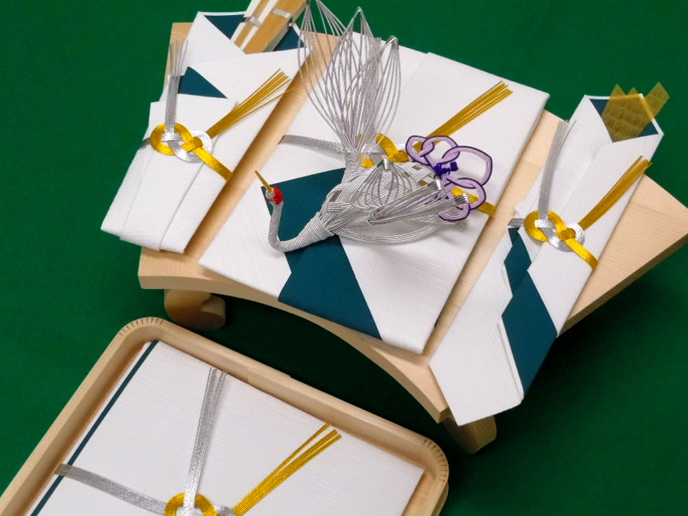 材料手漉き檀紙、顔料染め緑紙、水引、本熨斗