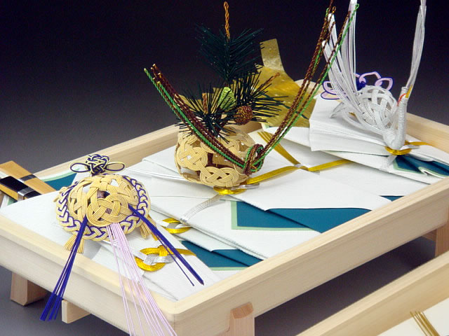 | 内容 | 熨斗、末広(男性用白扇・女性用白扇)、祝儀袋、水引の飾り、玉縁尺四台、目録、玉縁片木 |