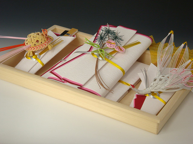 内容京水引の飾り、受書、 熨斗、末広(男持ち白扇、女持ち金銀扇子)、お多芽紙、玉縁台