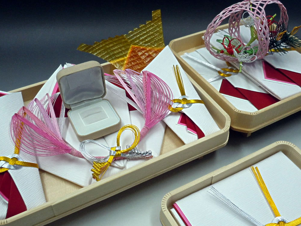 | 内容 | 熨斗、末広(男性用モーニング扇子・女性用黒塗り金銀扇子)、祝儀袋、水引の飾り、指輪飾り、祝儀台(大・小)、目録、片木 |