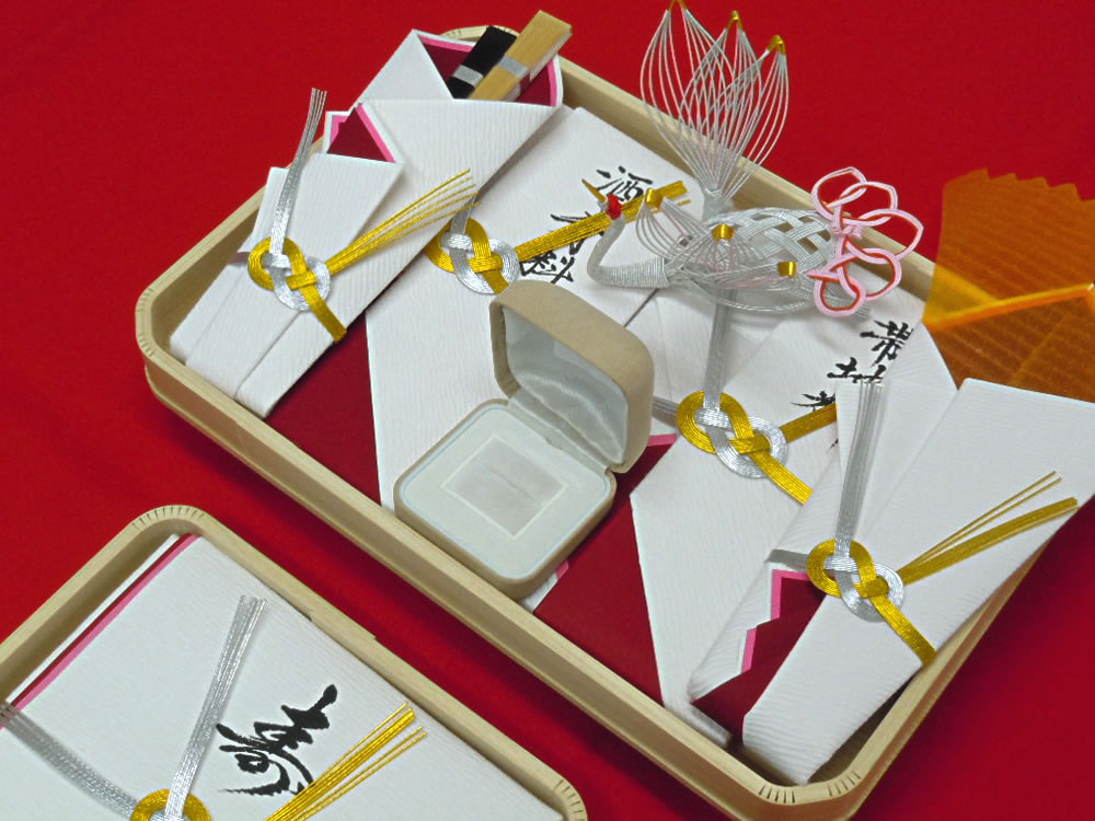 | 内容 | 熨斗、末広(男性用モーニング扇子・女性用黒塗り金銀扇子)、祝儀袋、水引の飾り、指輪飾り、祝儀台(大)、目録、片木 |